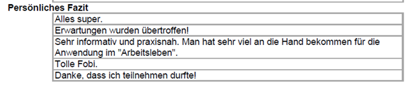 Damit Sie ein noch genaueres Bild von von meiner Arbeit bekommen können, habe ich einen meiner langjährigen Auftraggeber gefragt, ob ich Ausschnitte aus den Auswertungen der Feedbackbögen veröffentlichen darf.